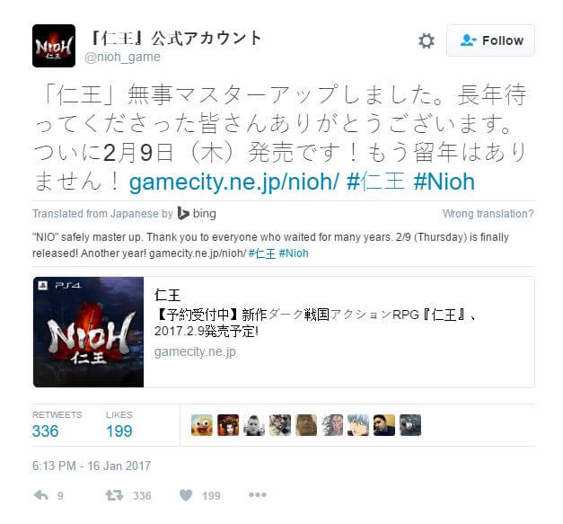 Pihak pengeluar permainan video Nioh, KOEI mengumumkan bahawa permainan ini sudah siap sepenuhnya, dan boleh dijual pada bila-bila masa sahaja. Nioh yang mula diumumkan semenjak tahun 2004, secara asalnya akan dipasarkan secara eksklusif untuk platform PlayStation 3, namun atas beberapa tundaan dan isu, ianya dibawa sehingga generasi konsol kini, PlayStation 4.