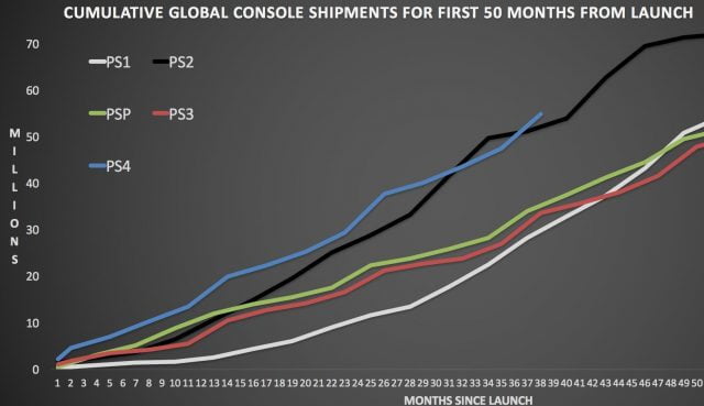 Mengikut dari carta diatas melalui sumber PS4Daily, konsol PlayStation 4 bermula dengan jualan yang amat positif, ini berikutan oleh tag harga yang diumum oleh Sony agak berpatutan pada masa pelancaran.