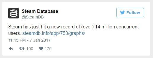 Mengikut dari PC Gamer, Steam pernah mencapai 5 juta pengguna log masuk dalam satu masa pada tahun 2012. Ianya agak mengagumkan dengan peningkatan 9 juta pengguna didalam lima tahun. Namun data 14 juta adalah berdasarkan pengguna log masuk didalam satu masa, maka ianya mengandungi pengguna yang bermain dan tidak bermain.