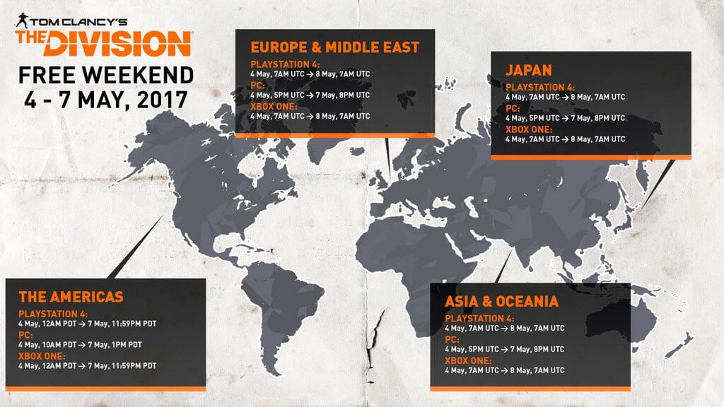 Ubisoft mengumumkan bahawa permainan The Division boleh dimainkan secara percuma untuk sementara waktu. Permainan didalam bentuk penuh akan diberi secara “trial” bermula pada hari ini 3PM untuk konsol PlayStation 4 dan Xbox One, manakala 1AM (Jumaat pagi) untuk platform PC.